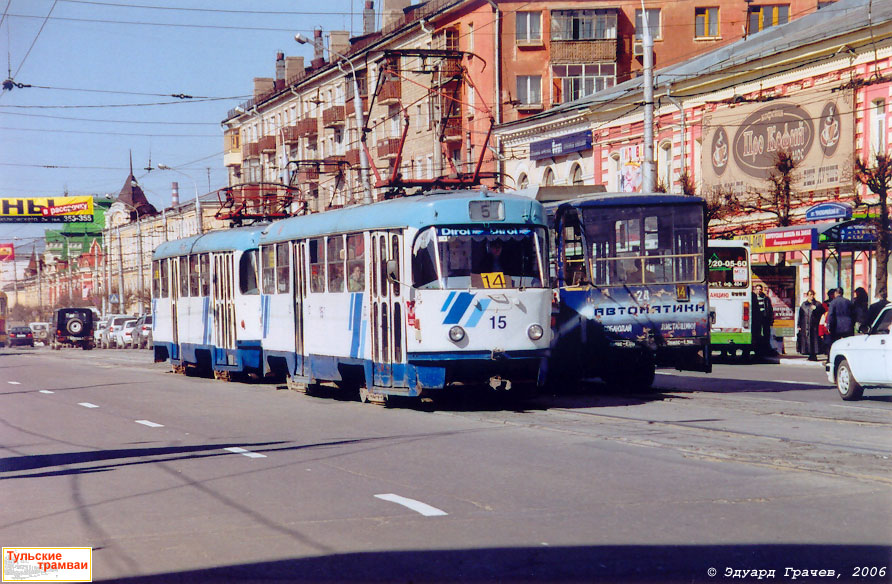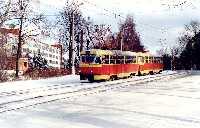 | Поезд из вагонов "Татра" Т-3 номер 15 и 16 на улице Советской. Дата съемки: 26 апреля 2006 года. Фотография: Э. Грачев |