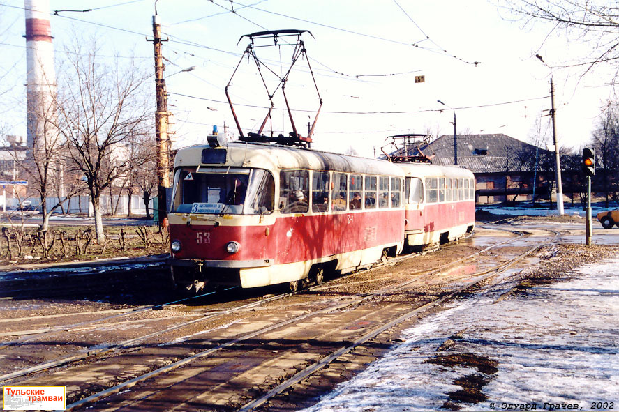 | Поезд из вагонов "Татра" Т-3 номер 53 и 54 (депо N 1) на улице Коминтерна. Дата съемки: 3 марта 2002 года. Фотография: Э. Грачев |
