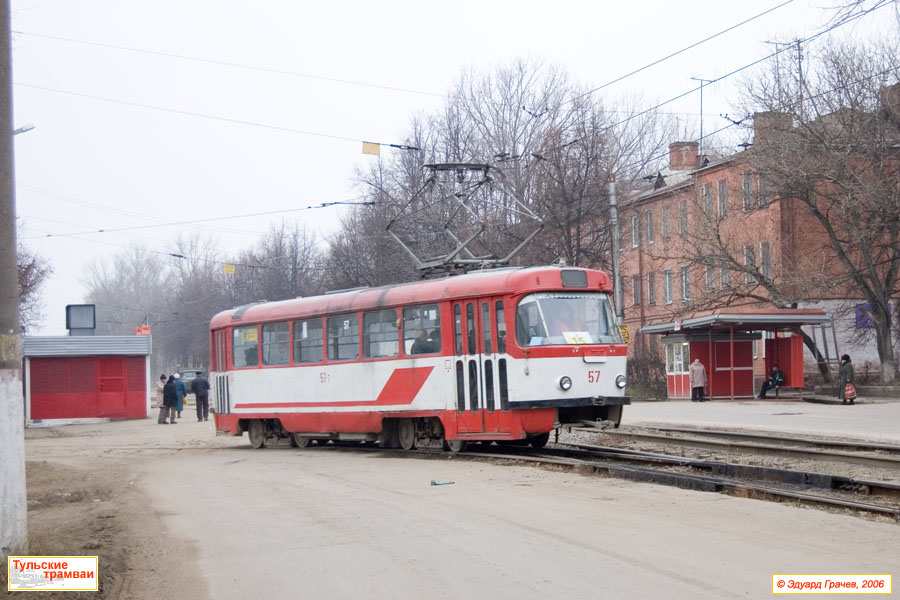 | Вагон № 57. 1932 - 1949 (1961) г.: прицепной 1949 (1961) - 1970 (1974) г.: КТП-1 1974 - по настоящее время: "Татра" Т-3 |