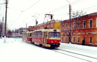 | Поезд из вагонов "Татра" Т-3D номер 75 и 76 (депо N 1) на линейной станции "Менделеевский поселок" Дата съемки: 4 декабря 2005 года. Фотография: Э. Грачев |