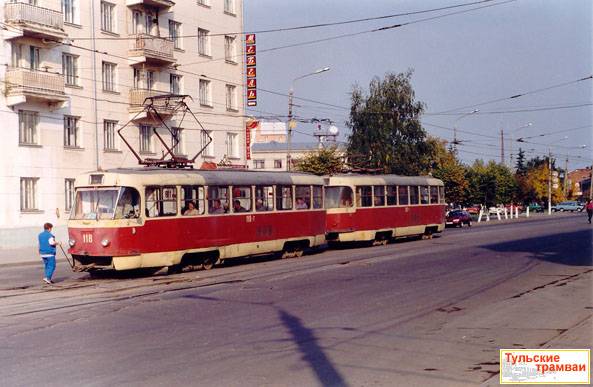 Поезд из вагонов "Татра" Т-3 номер 118 и 119 (депо N 1) на ул. Советской.