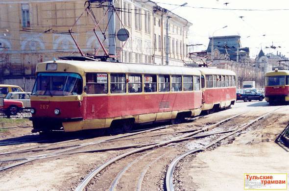 Поезд из вагонов "Татра" Т-3 номер 267 и 268 (депо N 2) на ул. Советской.