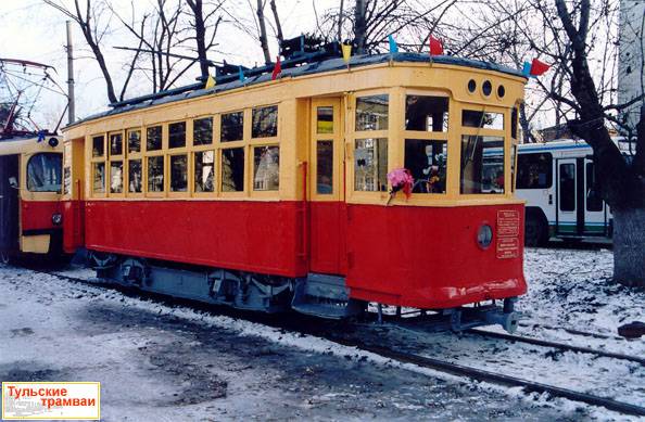 Музейный вагон серии "Х" на ул. Лейтейзена во время парада, посвященного 75-летию трамвая в Туле.