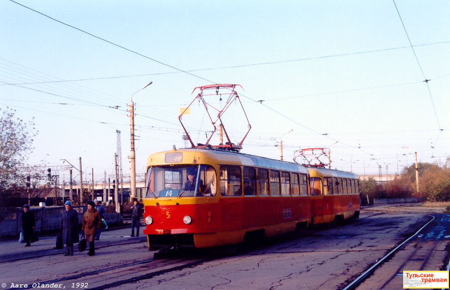 | Поезд из вагонов "Татра" Т-3 номер 5 и 6 (депо N 1) на линейной станции Московский вокзал. Дата съемки: 14 октября 1992 года. Фотография: Ааре Оландера (Эстония) |