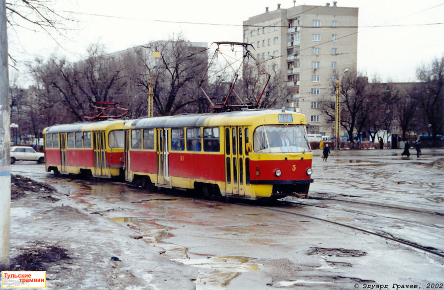 | Поезд из вагонов "Татра" Т-3 номер 5 и 6 (депо N 1) на улице Кауля. Дата съемки: 13 февраля 2002 года. Фотография: Э. Грачев |