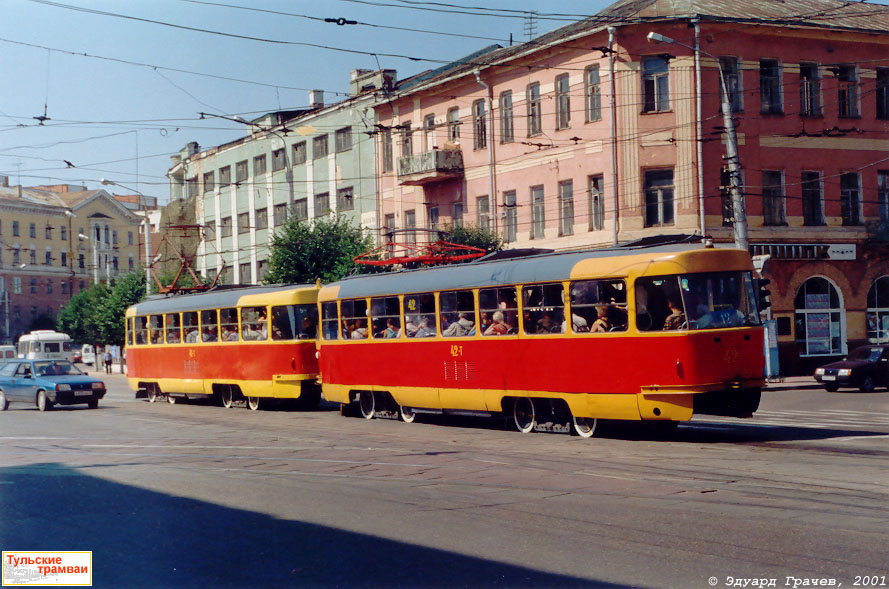 | Поезд из вагонов "Татра" Т-3 номер 41 и 42 (депо N 1) на улице Советской. Дата съемки: 18 июля 2001 года. Фотография: Э. Грачев |