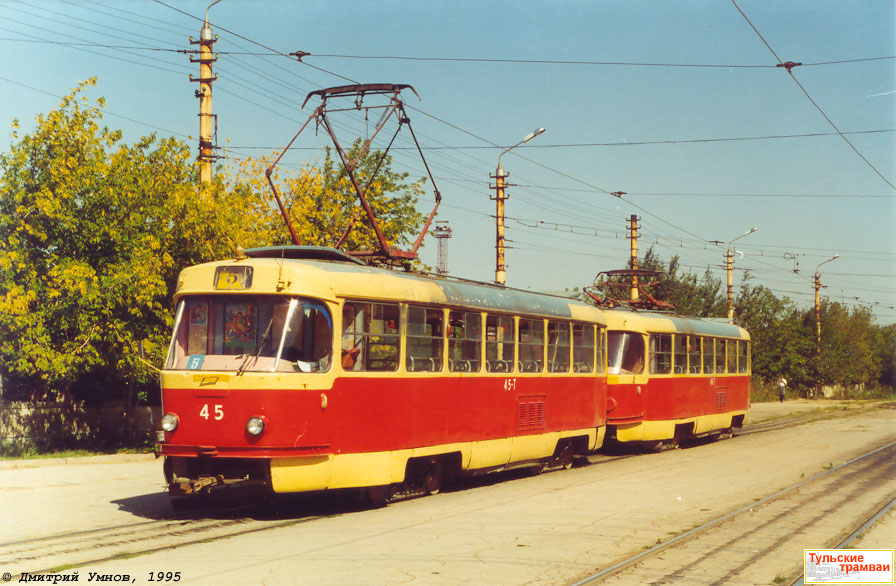 | Поезд из вагонов "Татра" Т-3 номер 45 и 46 (депо N 1) на линейной станции "Московский вокзал". Дата съемки: 25 августа 1995 года. Фотография: Дмитрий Умнов |