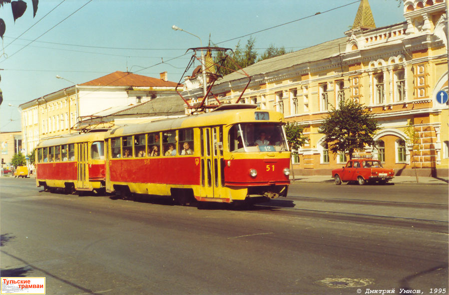 | Поезд из вагонов "Татра" Т-3 номер 51 и 52 (депо № 1) на улице Советской. Дата съемки: 25 августа 1995 года. Фотография: Дмитрий Умнов |