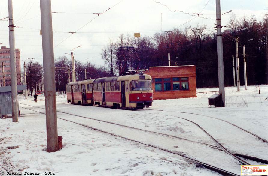 | Поезд из вагонов "Татра" Т-3 номер 53 и 54 (депо N 1) на линейной станции "Щегловская засека". Дата съемки: 11 января 2001 года. Фотография: Э. Грачев |