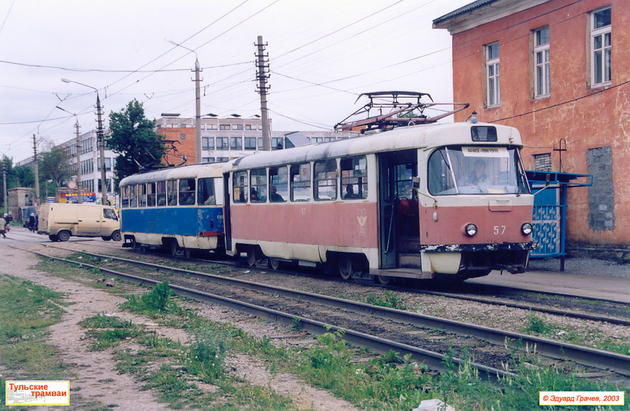 | Поезд-челнок из вагонов "Татра" Т-3 номер 57 и 63 (депо № 1) на остановке "Улица Фрунзе" Дата съемки: 30 июня 2003 года. Фотография: Э. Грачев |