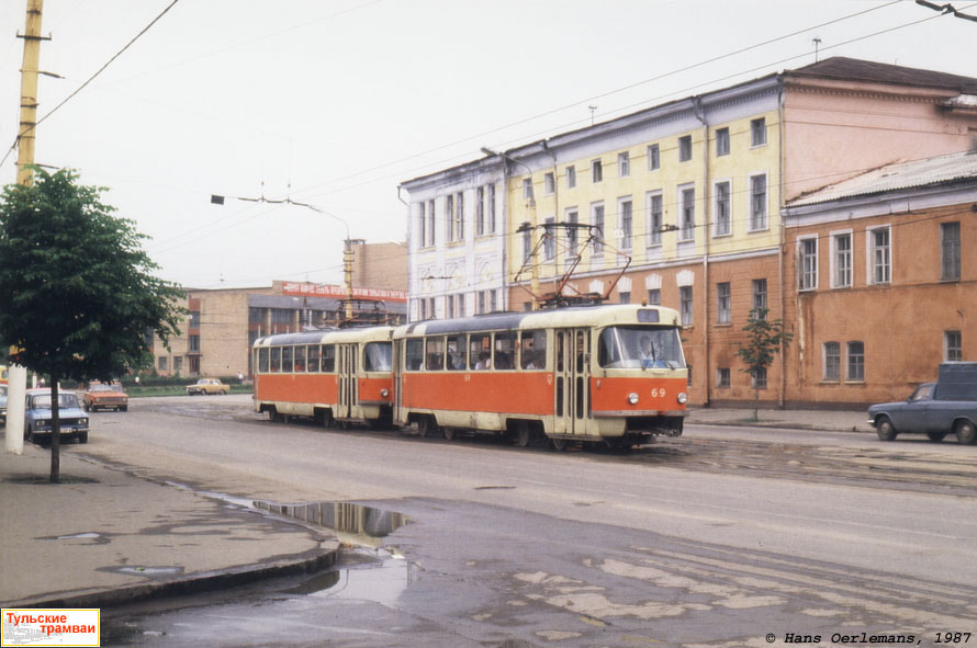 | Поезд из вагонов "Татра" Т-3 номер 69 и 70 (депо N 1) на улице Советской. Дата съемки: 18 июня 1987 года. Фотография: Hans Oerlamans (Rotterdam) из коллеции Ааре Оландера (Эстония) |