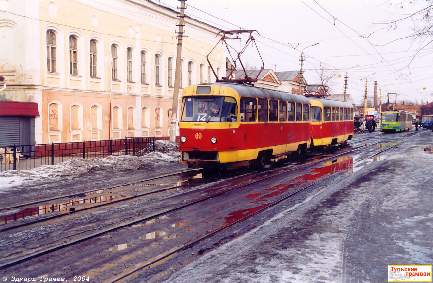 | Поезд из вагонов "Татра" Т-3 номер 69 и 70 (депо N 1) на улице Коминтерна. Дата съемки: 08 марта 2004 года. Фотография: Э. Грачев |