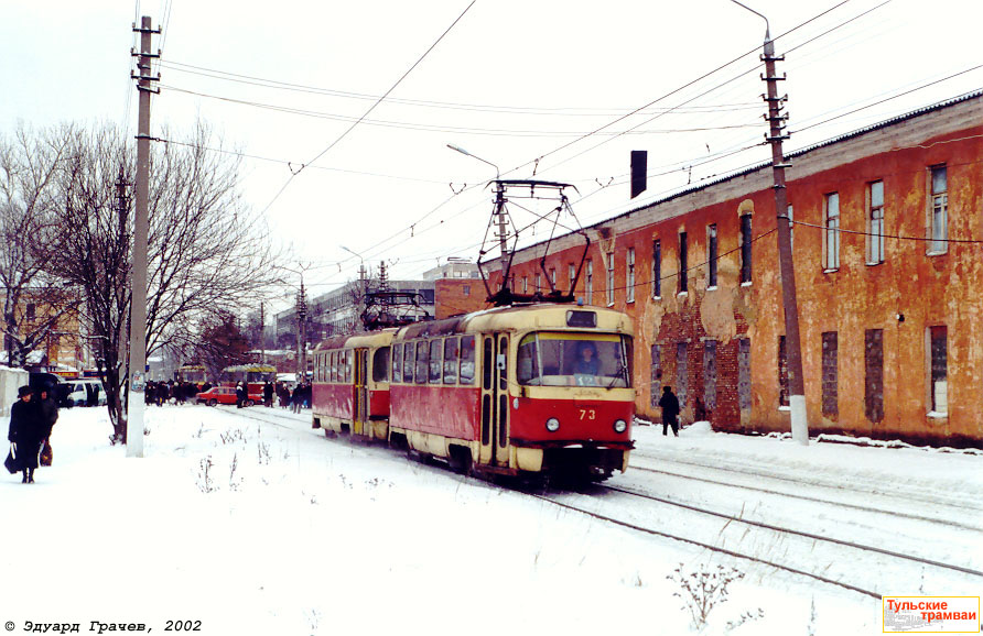 | Поезд из вагонов "Татра" Т-3 номер 73 и 74 (депо N 1) на улице Коминтерна. Дата съемки: 5 января 2002 года. Фотография: Э. Грачев |