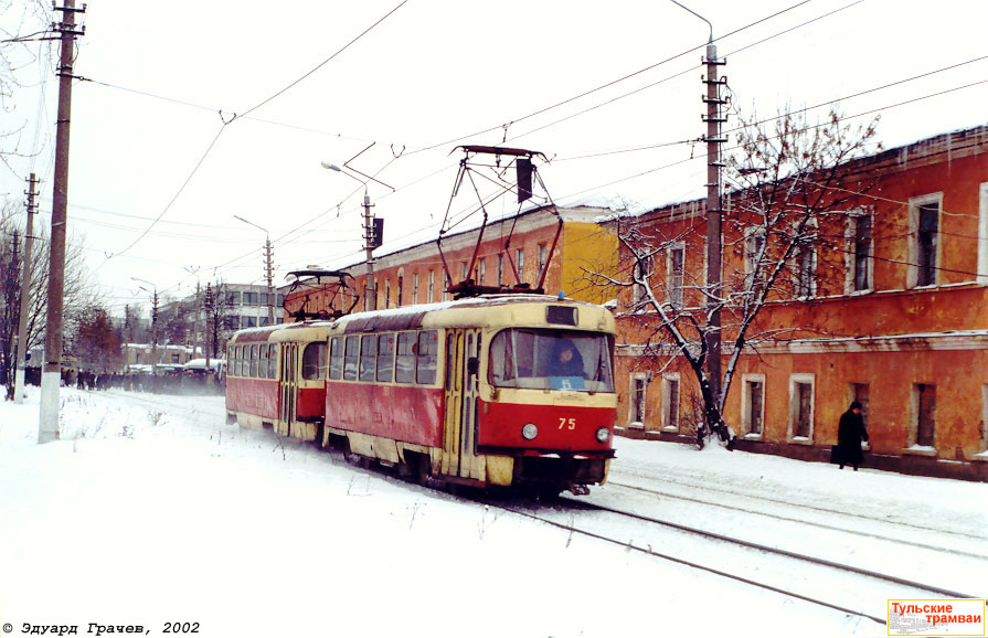 | Поезд из вагонов "Татра" Т-3 номер 75 и 76 (депо N 1) на улице Коминтерна Дата съемки: 5 января 2002 года. Фотография: Э. Грачев |