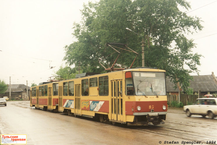 | Поезд из вагонов "Татра" Т6Б5 номер 83 и 84 (депо N 1) на улице Оборонной. Дата съемки: 8 июня 1994 года. Фотография: Stefan Spengler (Leipzig) из коллекции Ааре Оландера (Эстония) |