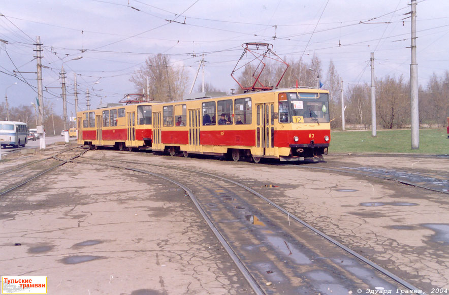 | Поезд из вагонов "Татра" Т6Б5 номер 83 и 84 (депо N 1) на линейной станции "Менделеевский поселок". Дата съемки: 1 мая 2004 года. Фотография: Э. Грачев |