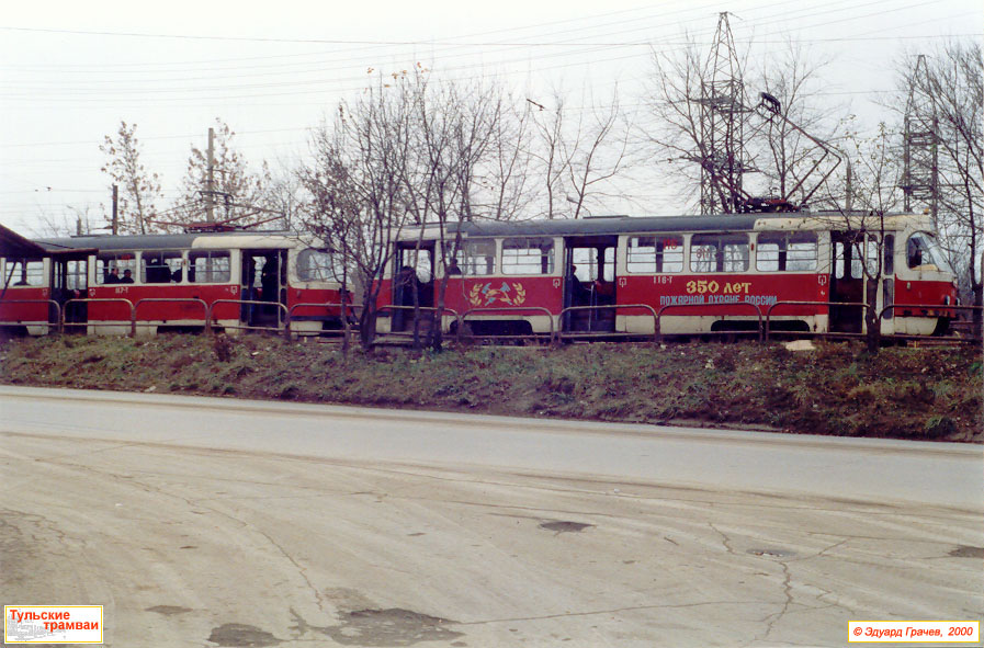 | Поезд из вагонов "Татра" Т-3 номер 116 и 117 (депо N 1) на линейной станции "Кондитерская фабрика "Ясная Поляна" Дата съемки: 7 ноября 2000 года. Фотография: Э. Грачев |