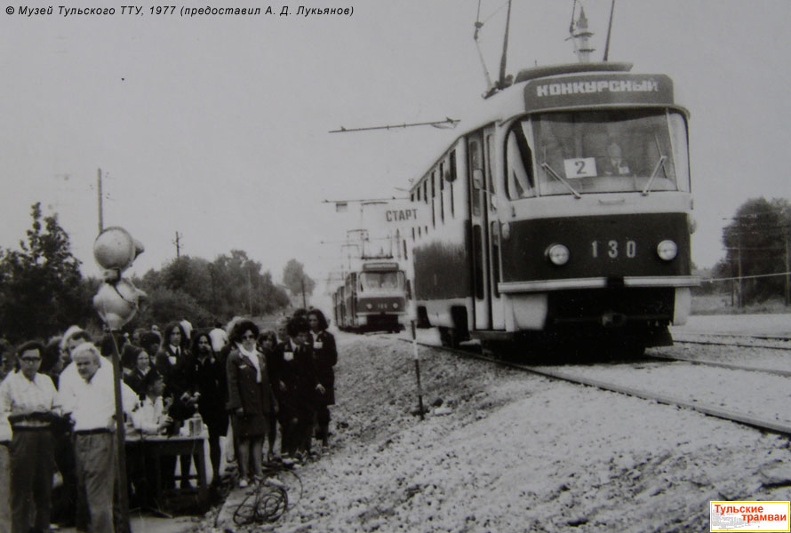| Вагон "Татра" Т-3 № 130 (депо № 1)  на проспекте Ленина во время Всесоюзного конкурса водительского мастерства. Дата съемки: 1977 год. Фотография: Из музея Тульского ТТУ (предоставил А. Д. Лукьянов) |