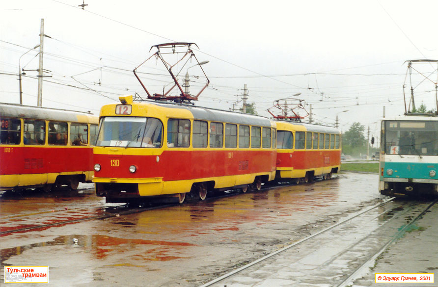 | Поезд из вагонов "Татра" Т-3 номер 130 и 131 (депо N 1) на линейной станции "Менделеевский поселок" Дата съемки: 13 мая 2001 года. Фотография: Э. Грачев |