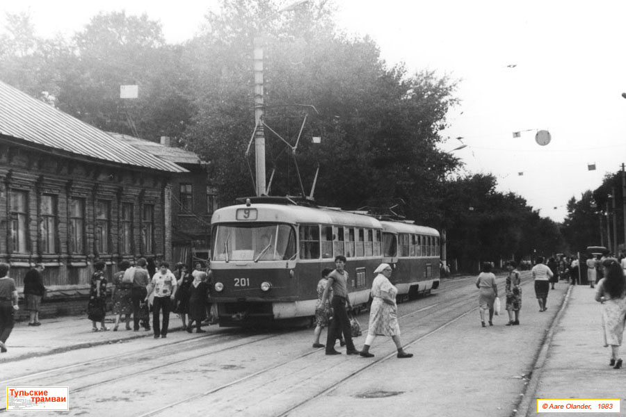 | Поезд из вагонов "Татра" Т-3 номер 201 и 202 (депо № 2) на остановке "Улица Советская" Дата съемки: 12 июля 1983 года. Фотография: Ааре Оландера (Эстония) |