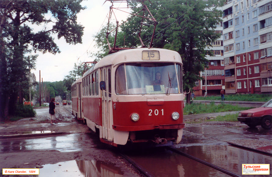 | Поезд из вагонов "Татра" Т-3 номер 201 и 202 (депо № 2) на улице Марата Дата съемки: 8 июня 1994 года Фотография: Ааре Оландера (Эстония) |