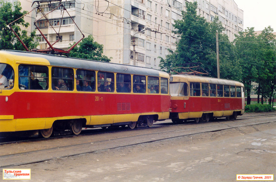 | Поезд из вагонов "Татра" Т-3 номер 201 и 265 (депо № 2) на улице Епифанской Дата съемки: 20 мая 2001 года Фотография: Э. Грачев |