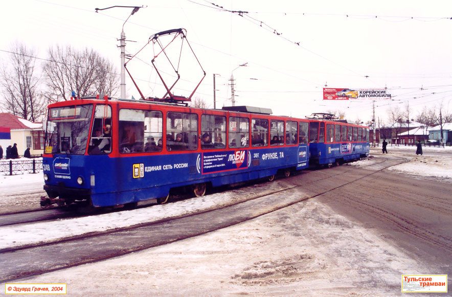 | Поезд из вагонов "Татра" Т6Б5 номер 348 и 349 (депо № 2) на улице Советской Дата съемки: 8 февраля 2004 года. Фотография: Э. Грачев |