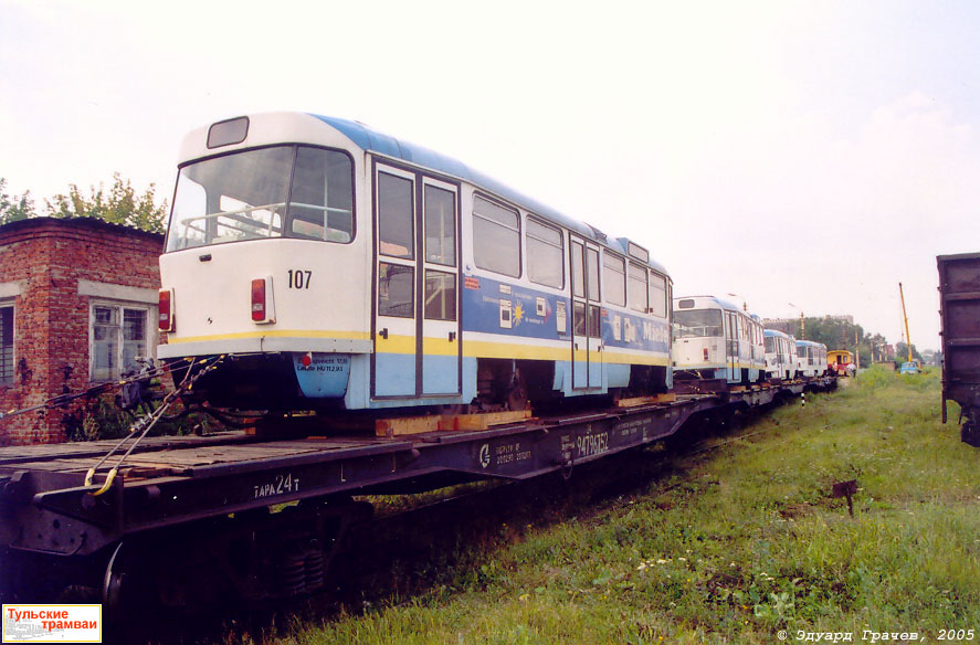 | Вагоны "Татра" Т-3D номера 107, 207, 210, 110 (Шверин, Германия) на станции Тула-1-Курская. Дата съемки: 23 июля 2005 года. Фотография: Эдуард Грачев |