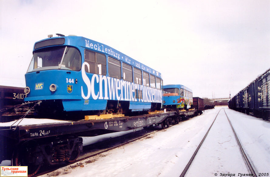 | Вагоны "Татра" Т-3D номер 144 и 244 (Шверин, Германия) на станции Тула-1-Курская. Дата съемки: март 2005 года. Фотография: Эдуард Грачев |